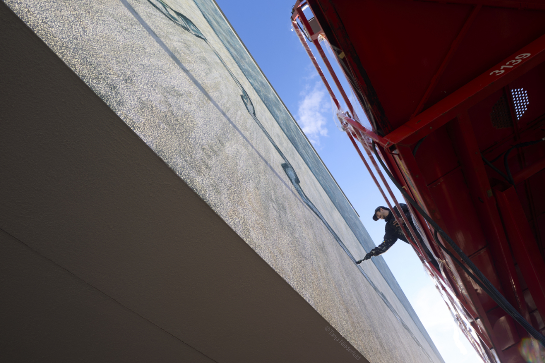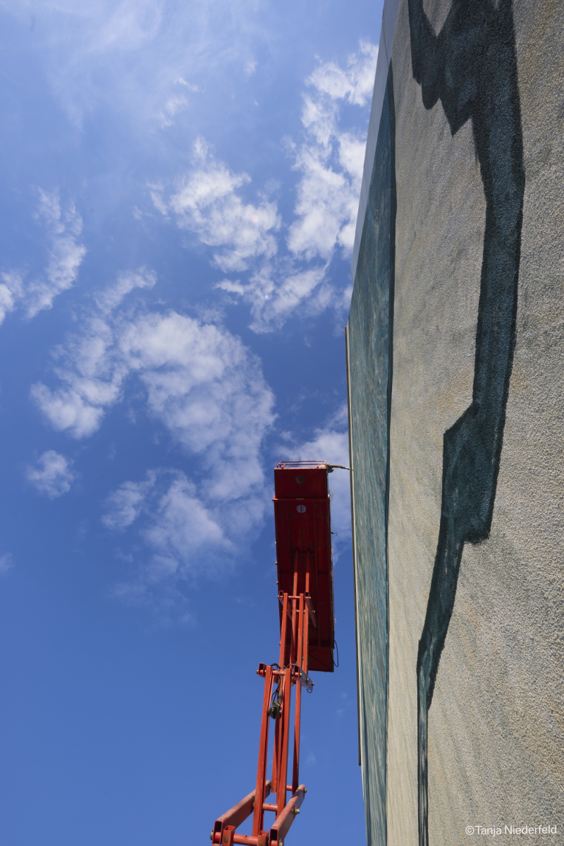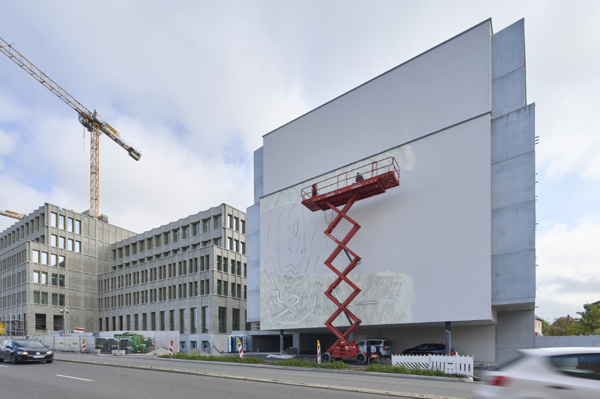 Im Zuge des Neubaus des Landratsamts Reutlingen hat die GSW Sigmaringen ein Wohngebäude in der Ludwigstrasse 17 errichtet. Dessen fensterlose Nordfassade ist zur vielbefahrenen Stuttgarter Strasse hin ausgerichtet. Die Reutlinger Künstlerin hat den Zuschlag für die Gestaltung der rund 280 qm großen Fassade erhalten.